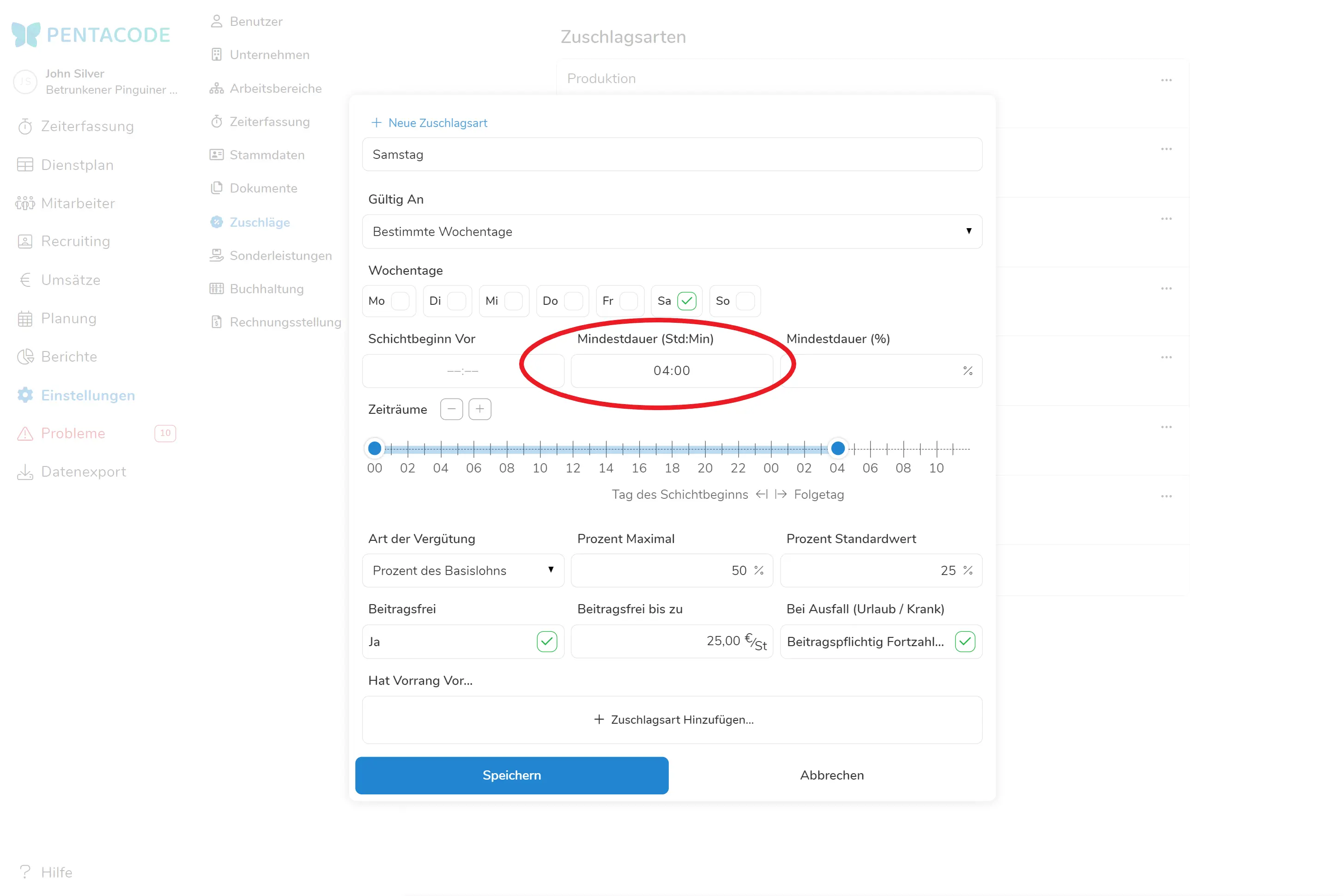 Beispiel: Wenn 25% als Mindestdauer angegeben werden, wird bei einer 8-Stunden-Schicht erst der Zuschlag angewandt, wenn 2 Stunden der Schicht innerhalb des Zuschlagszeitraums liegen.