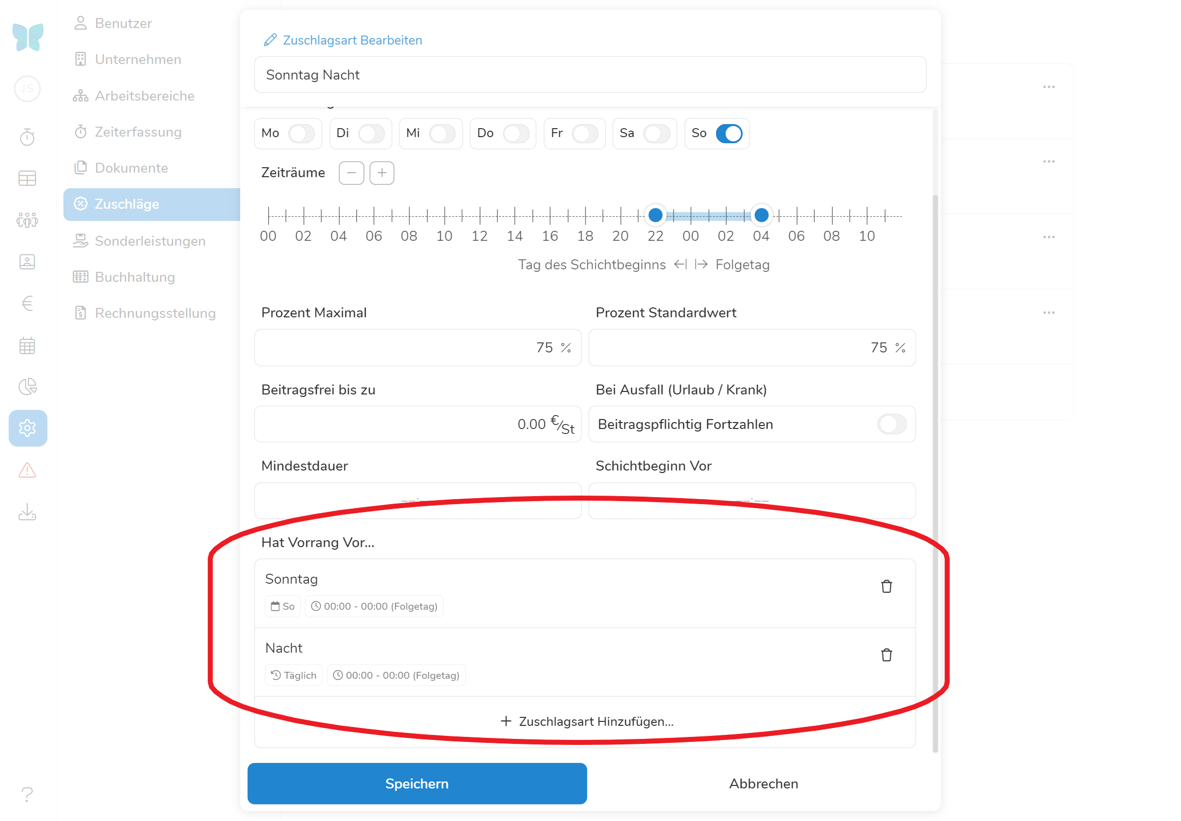 Es passiert des Öfteren, dass mehrere Zuschlagszeiträume aufeinander fallen. Stellen Sie sich etwa vor, ein Mitarbeiter arbeitet an einem Sonntag, der zugleich Feiertag ist. Oder eine Nachtschicht ragt von Samstag in den Sonntag. Für diese Fälle muss es klar sein, welche Zuschlagsart berücksichtigt werden soll. Wählen Sie dazu hier die Zuschlagsarten aus, die vom aktuell ausgewählten Zuschlag überschrieben werden sollen.