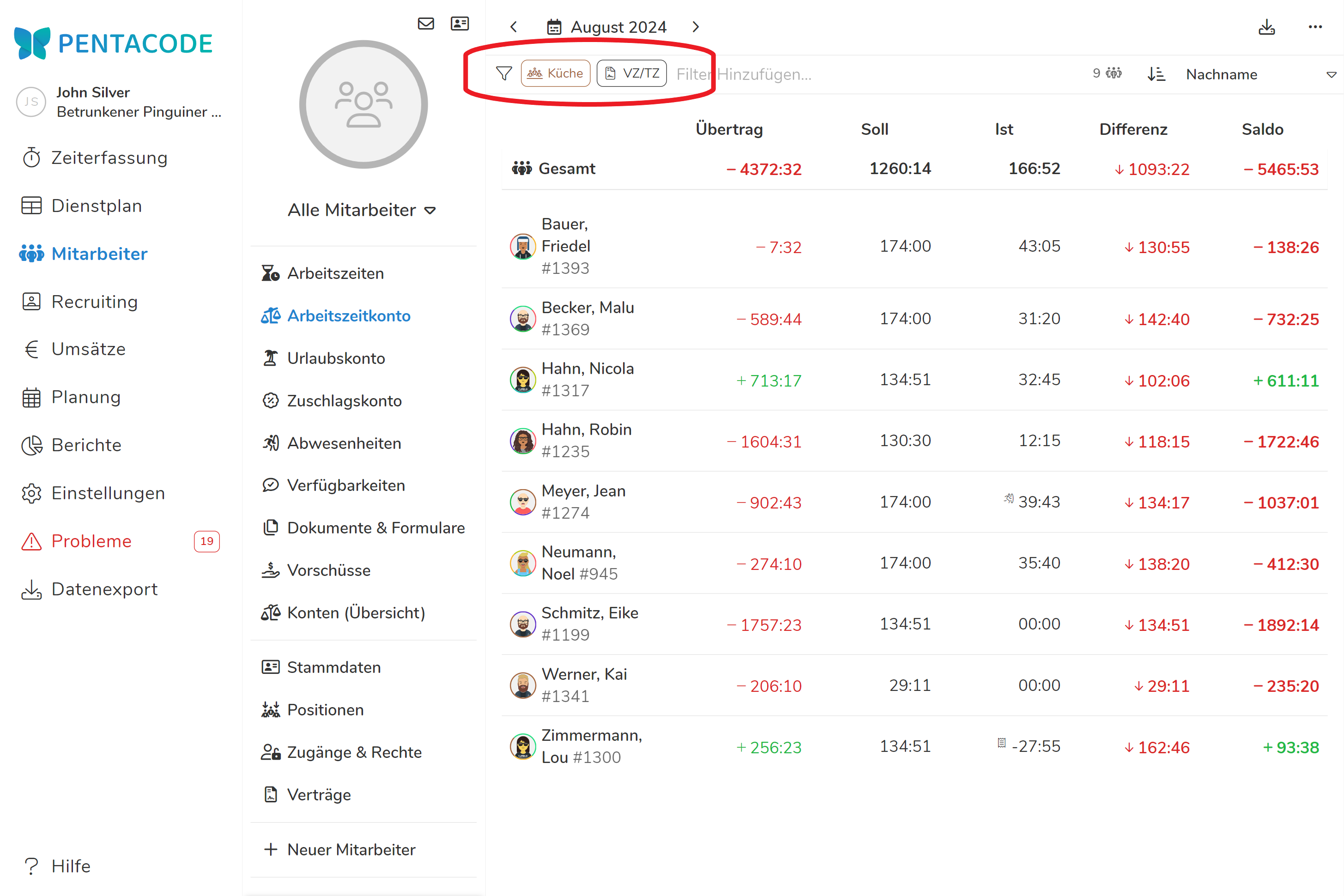 Der Filter beeinflusst nur, welche Mitarbeiter angezeigt werden! Die Stunden werden für die Mitarbeiter aber stets aus allen Positionen berechnet.