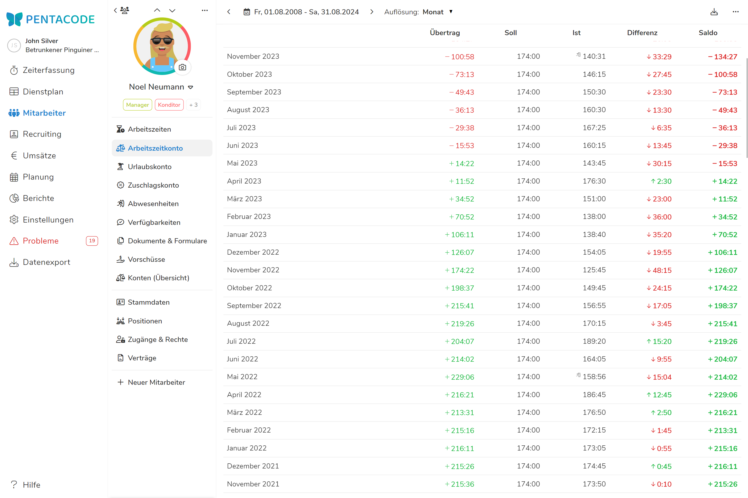 Pentacode bietet Ihnen hierfür die Möglichkeit, den Übertrag eines Monats für eines oder alle Konten eines Mitarbeiters zu bearbeiten.