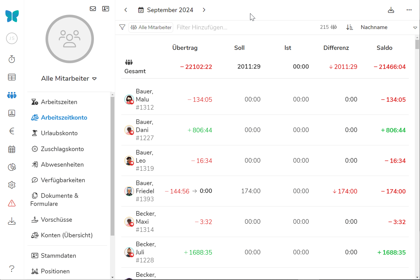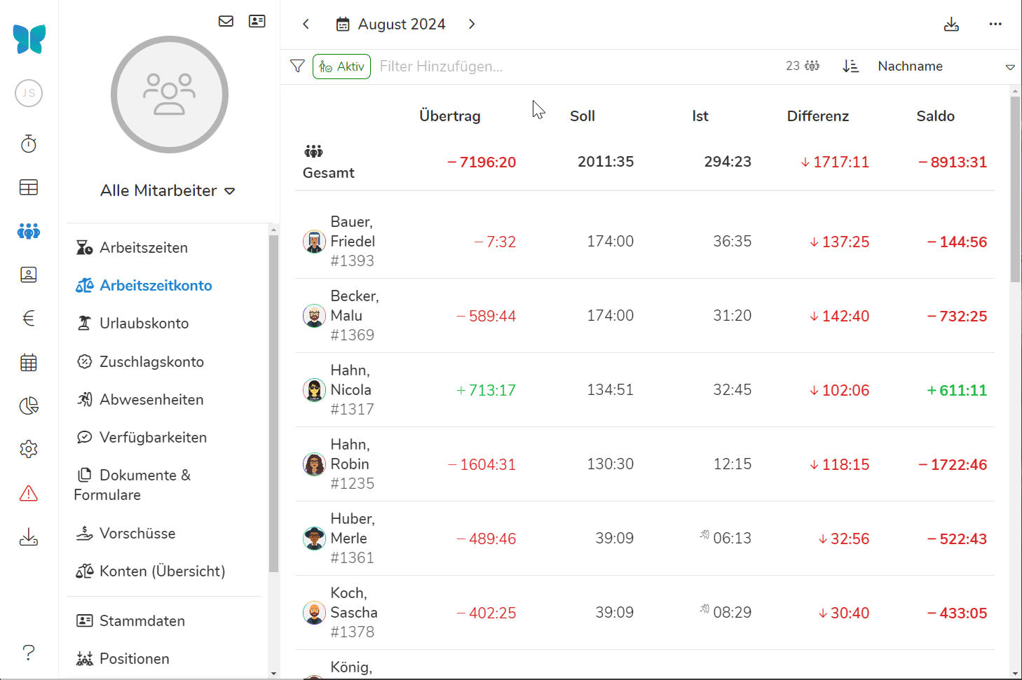 In der Übersicht können Sie die Arbeitszeiten all ihrer Mitarbeiter über einen selbst gewählten Zeitraum einsehen. Dabei werden fünf Werte im Format Stunden:Minuten angezeigt: