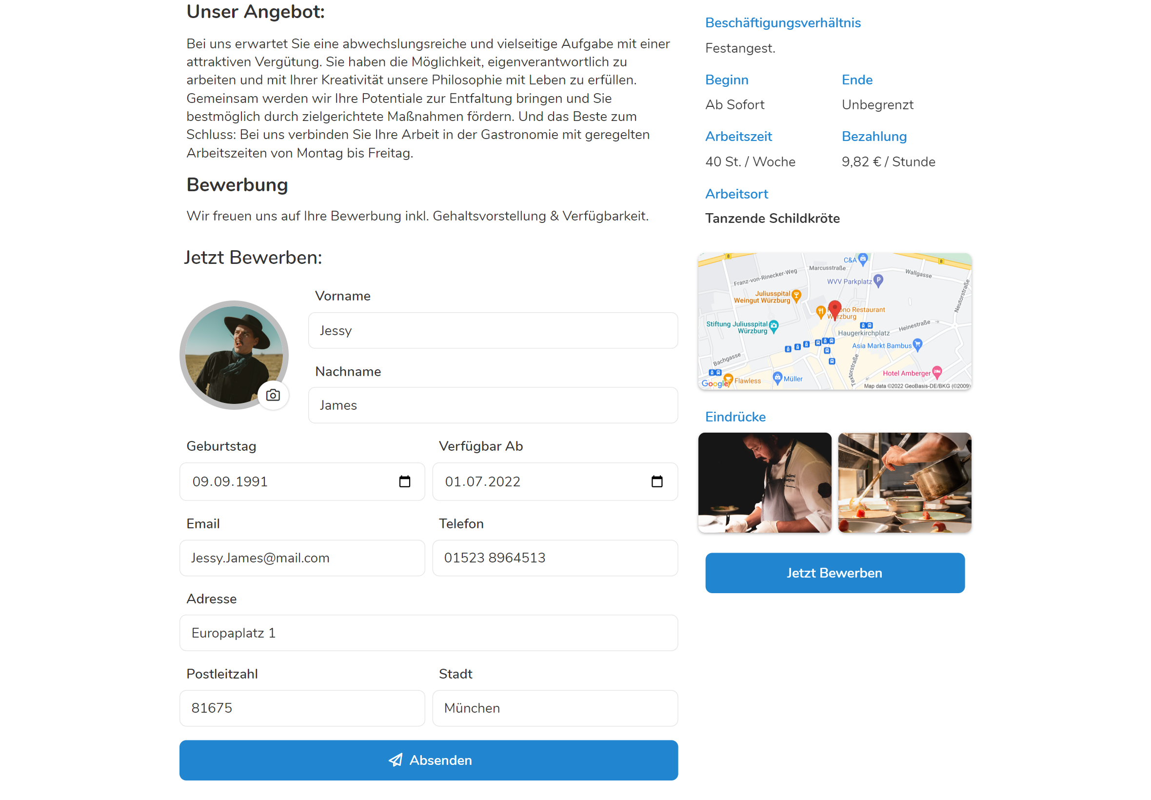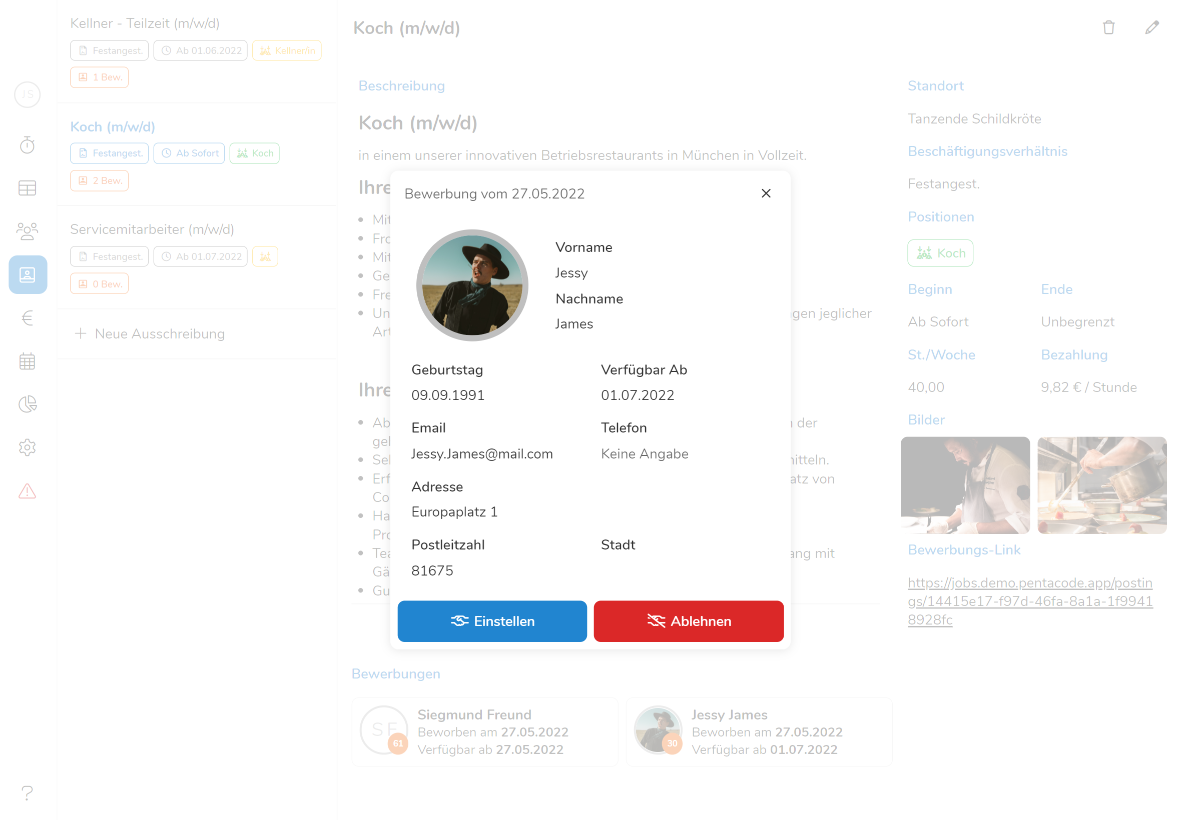 Nachdem ein interessierter Bewerber auf ihre Ausschreibung gestoßen ist und den Bewerbungslink angeklickt oder eingescannt hat, gelangt er in die Bewerberansicht. Hier sieht er zum einen Titel, Inhalt und Details der Stelle, zum anderen kann er sich über ein Formular direkt bewerben. In diesem Formular wird er gebeten seine Daten anzugeben - darunter zählen Vor- und Nachnamen, Geburtsdatum, Email Adresse, Telefonnummer, Verfügbarkeit und Wohnadresse. Zudem kann er ein Bild von sich hochladen, um es der Bewerbung beizufügen. Mit einem Klick auf landet die Bewerbung nun direkt in ihrem Pentacode Verwaltungszugang.