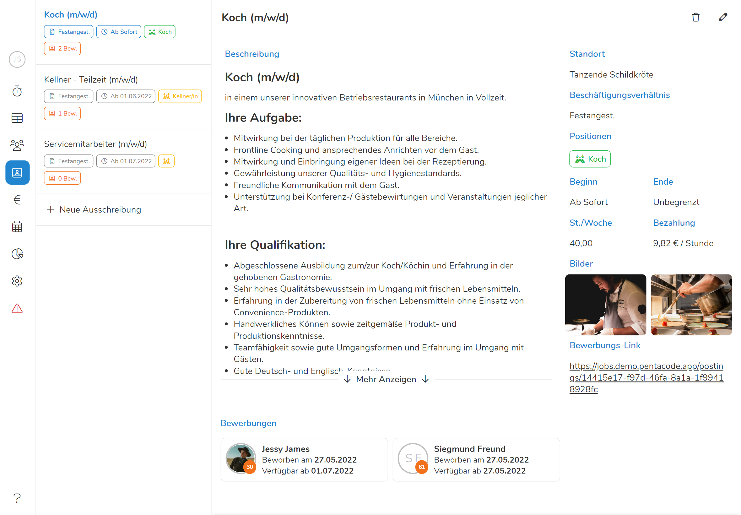 Nachdem Sie eine Ausschreibung erstellt haben, geht es nun darum die Stelle zu veröffentlichen und die Bewerber zu verwalten. Dazu bietet ihnen Pentacode praktische Link zum Publizieren der Ausschreibung, ein eigenes Bewerbungsformular und eine Funktion zum Einstellen auf Probe.